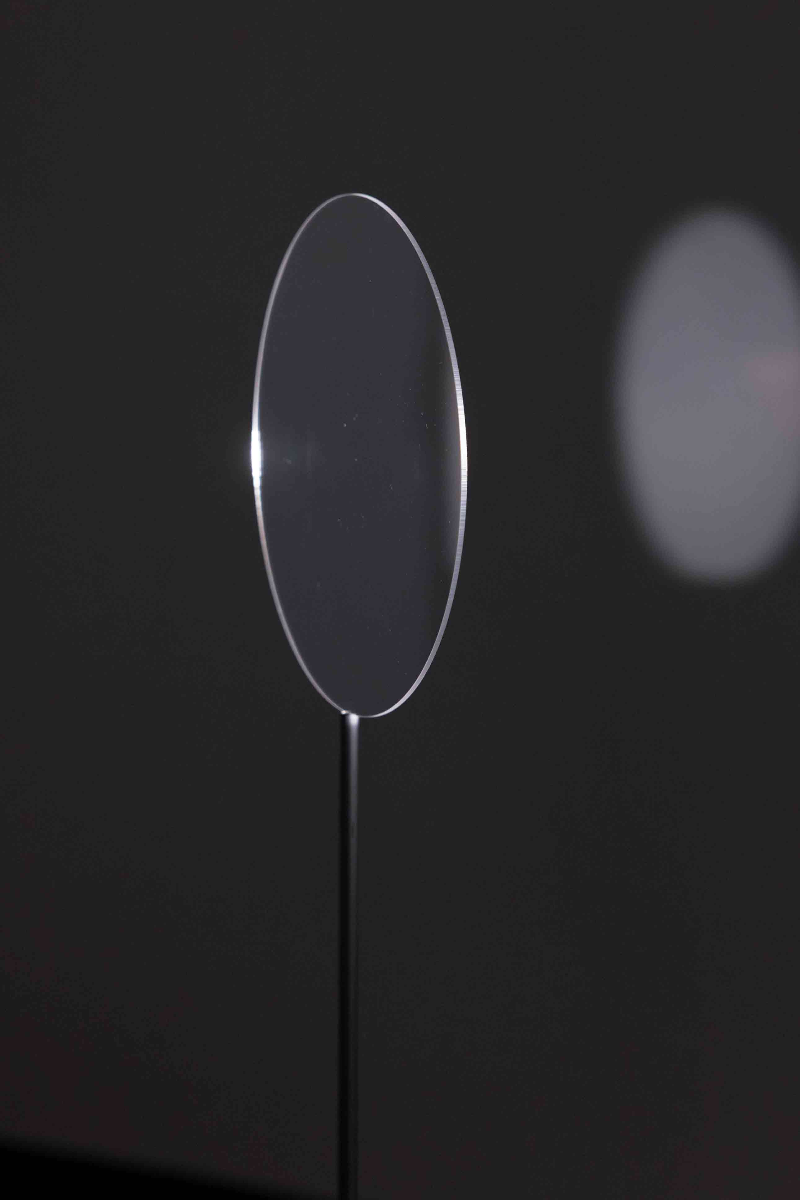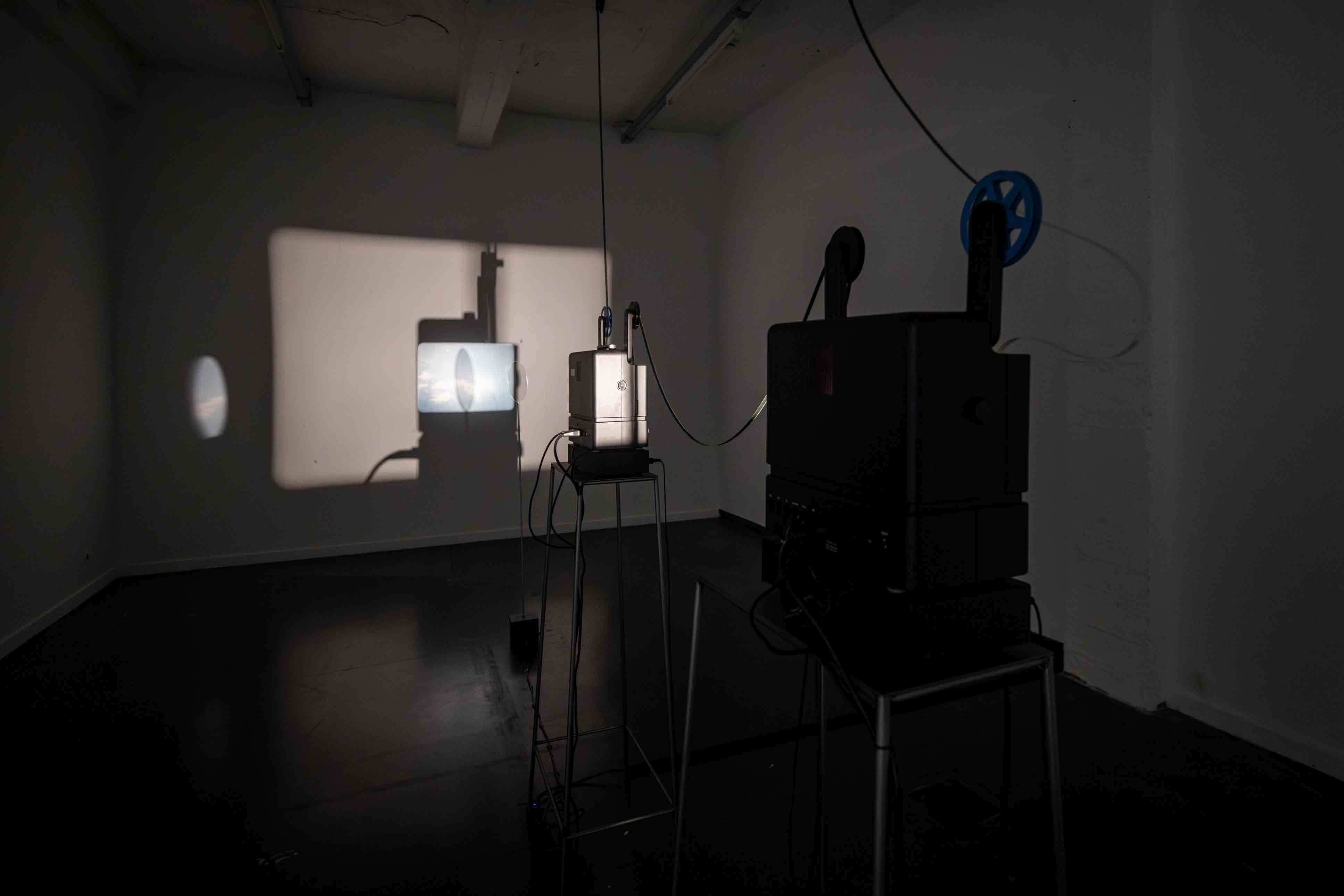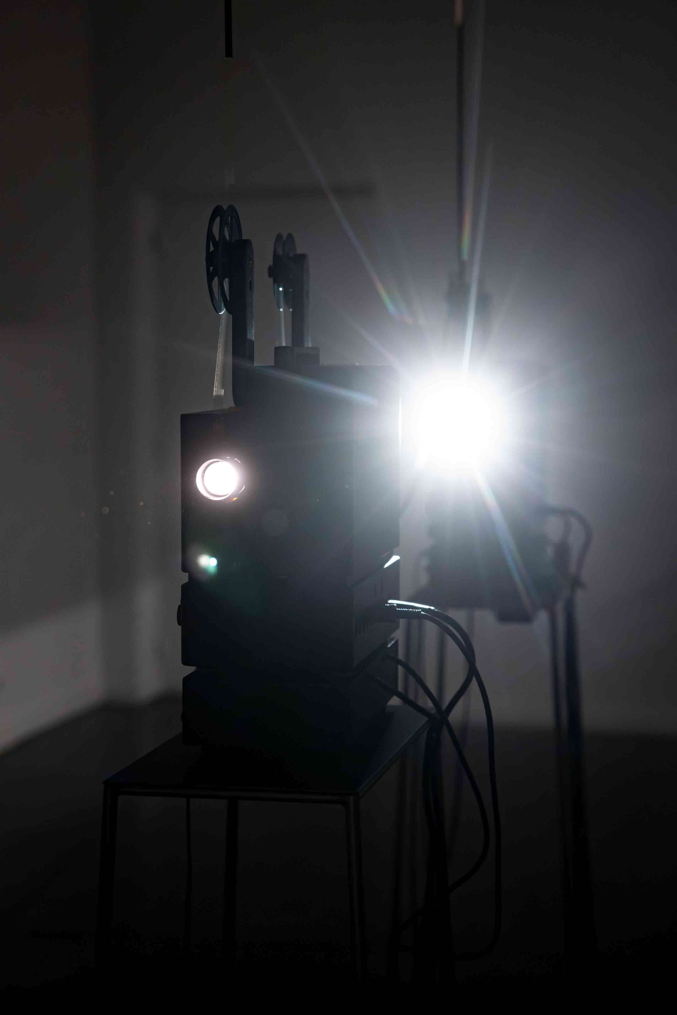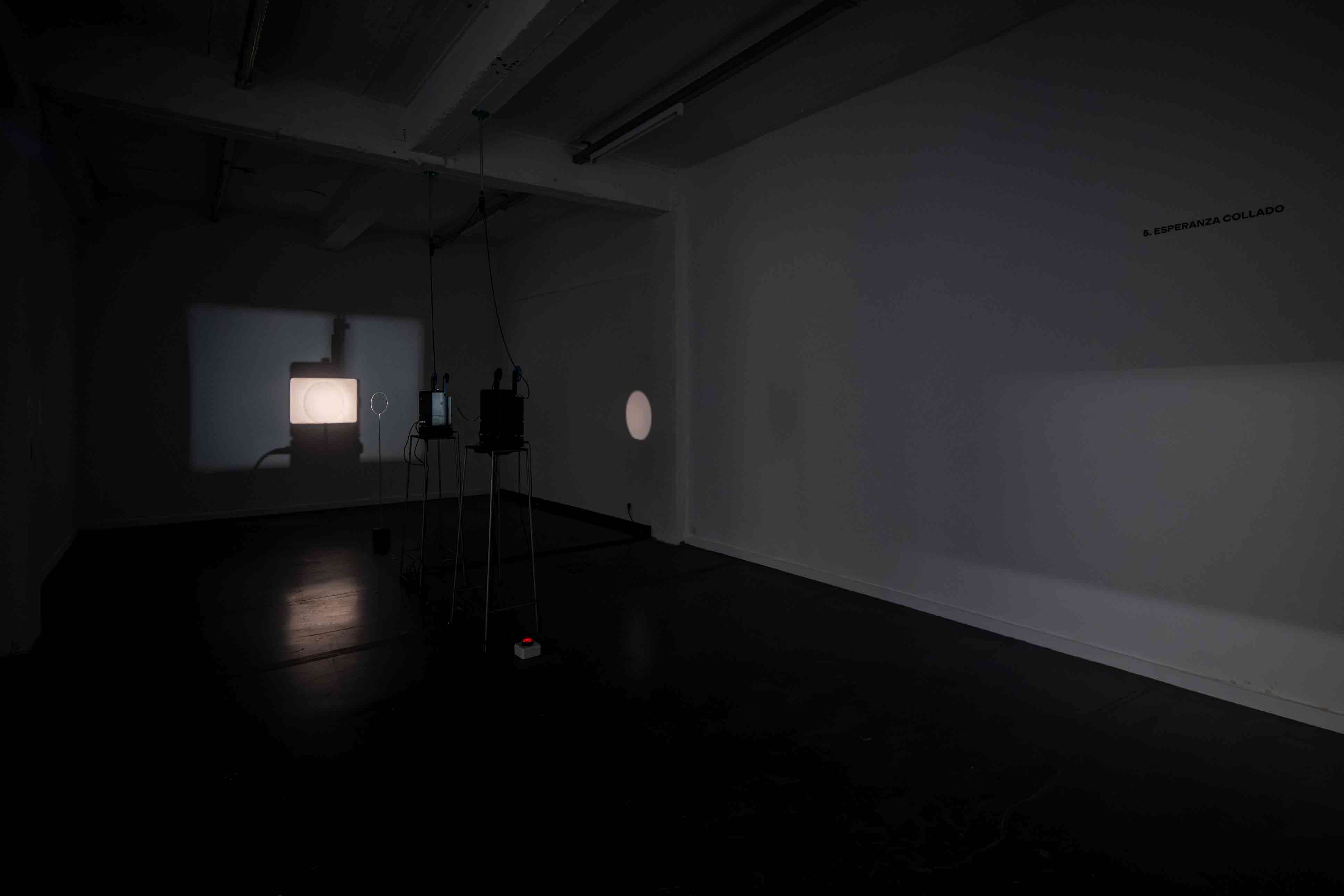The installation consists of two Super 8mm projectors placed concentrically. The rear projector casts the shadow of the front projector, which in turn projects its image within its own shadow. This setup creates a “mise en abyme” situation where image and shadow are inscribed in the same optical field, producing a visual paradox that explores cinema’s self-reflexivity and dialectical nature. The installation is completed by a rotating disc, functioning both as screen and reflective surface. This element disperses the projected image throughout the exhibition space, suggesting a deflected circulation of light and evoking Zulueta’s observations on the spatial displacement of light.